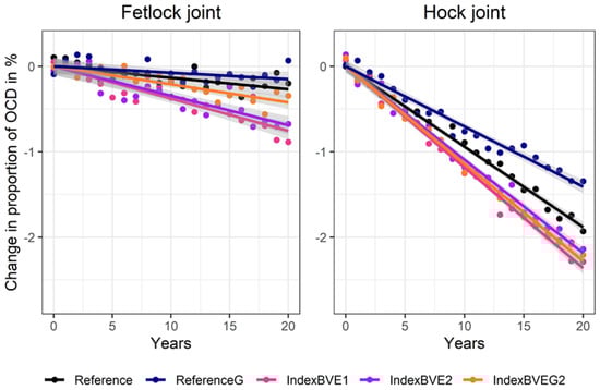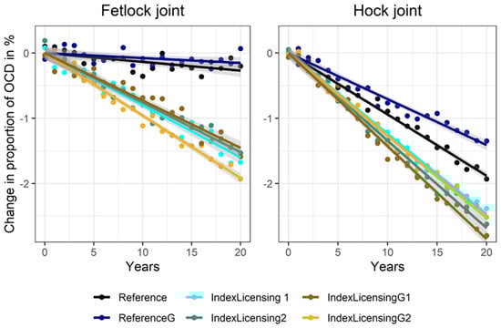 When additionally performing a selection step based on a selection index that considers OCD and the riding horse performance traits at the stage of stallion licensing (IndexLicensing1 and IndexLicensing2), improvements were on a comparable level to those obtained when using the best performing threshold selection (−1.6% and −1.6% in fetlock joint; −2.4% and −2.6% in the hock joint). The reduction of OCD frequency over time was very similar when using genomic breeding value estimation (IndexLicensingG1 and IndexLicensingG2). Note, however, that differences to the respective reference scenarios were again substantially larger (