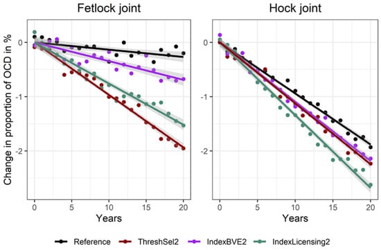 When the scenarios with the highest effect on the OCD traits from all considered scenario classes were compared, we observed a higher reduction of OCD for threshold selection (ThreshSel2) compared to the scenarios that were simply implementing OCD traits in the selection index for breeding stallions (IndexBVE2). However, when an additional selection step that accounted for OCD at the stage of stallion licensing (IndexLicensing2) was included, gains were very similar, with IndexLicensing2 leading to a slightly higher reduction in the hock joint and ThreshSel2 to a slightly higher reduction in the fetlock joint (