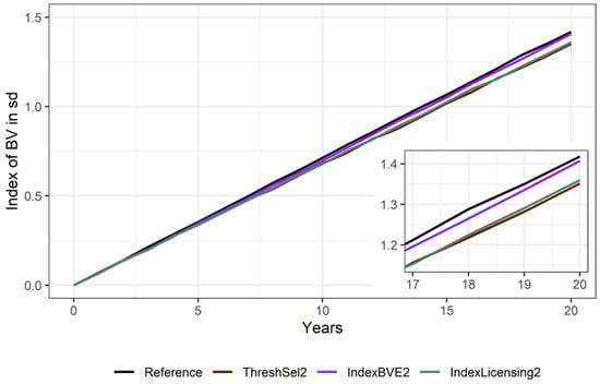 Figure 6). However, the difference between the most extreme scenarios (reference and ThreshSel2) was just 0.07 genetic standard deviations after 20 years.