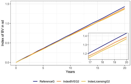 Additionally, the scenarios “Reference”, “IndexBVE2”, “IndexLicensing1” and “IndexLicensing2” were modeled using genomic BVE (ReferenceG, IndexBVEG2, IndexLicensingG1 and IndexLicensingG2) via single-step genomic best linear unbiased prediction (GBLUP) [
