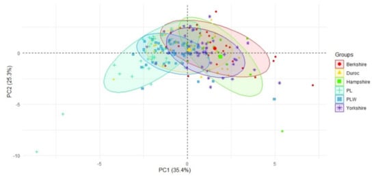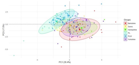 Figure 1, Figure 2 and Figure 3 indicate that Polish Large White and Polish Landrace sows gave birth to more alive piglets (in terms of both their number and percentage per litter) and had a smaller percentage of stillborn piglets than sows of the other breeds. Principal component analysis—PC1 and PC2 in particular—showed the greatest variation in the number of born alive and weaned piglets as well as in the percentage of weaned piglets between the sows of the Polish Landrace, Berkshire and Hampshire breeds (Figure 1).