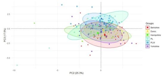 A scatterplot of the second PC against the third PC, with the indication of the breeds. The second PC was correlated with the farrowing and farrowing-to-conception intervals (negative correlation), while the third PC was correlated with the total number of born piglets per litter (positive correlation). Axes represent loadings onto components 2 and 3.