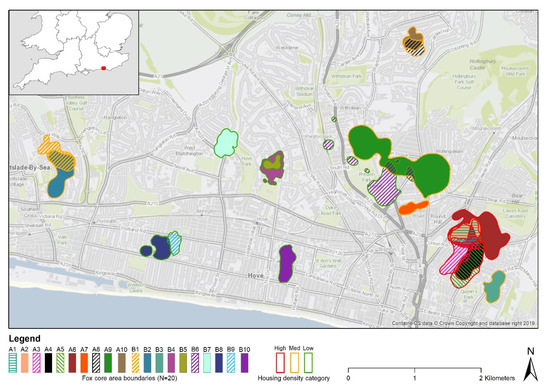 Location of fox core area ranges in six residential zones of the city of Brighton and Hove distributed across each of high, medium, and low housing density areas (low < 30; medium = 30–60; high > 60 usual resident households per hectare).