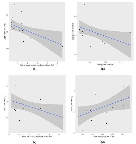 To investigate the effect of spatial variables on fox core area size, we generated a series of bivariate linear mixed models (LMMs) in R v. 3.6.1 (The R Foundation for Statistical Computing 2019, Vienna, Austria) using the package lme4. The response variable (core area size) was log-transformed to stabilize variances and allow parameter estimation based on the assumption that the data were generated from a Gaussian distribution. The response was then regressed separately against a series of fixed factors to test each of the three hypotheses selected from an initial set after accounting for multi-collinearity (see SI Figure S1 for correlation coefficients and scatterplot matrix) and discounted removal of collinear variables via variance inflation factor or similar procedures so as to retain all variables of biological importance. The selected fixed factors were ratio of garden to combined other habitats (H1); ED (garden scale); mean garden size (ha) (H2); number of patches at garden scale (log-transformed to meet assumptions of linear regression); and number of patches at landscape scale (H3). Sex of fox (male/female), season (spring/summer/autumn/winter), year of study (2012–2015), mean housing density across core area (usually resident households ha−1), and mean housing density squared (transformed to meet assumptions of linear regression) were controlled for via inclusion in additional bivariate models. Fox individual ID was included in each model as a random factor.