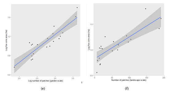 However, foxes must also range over more patches, regardless of whether these patches are fragmented, because different patches provide different resources. To confirm this corollary of H3, it is necessary to directly quantify resources and demonstrate that resource heterogeneity is linked to patch configuration, which we strongly recommend for future work. Resources in urban gardens include supplementary food provided by householders, ponds, shrubs or mature tree cover for diurnal rest sites, and spaces under sheds and other outside structures for dens personal observations, [14,16,44]. Fox group size and social connectivity have been linked to supplementary food provision in urban areas [14,45], but a link between resources and urban fox range size and structure has not, to our knowledge, been empirically demonstrated thus far. Natural food items are likely to be more numerous in larger gardens, consistent with species-area relationships [46] and concomitant with fox generalist life history. Larger gardens may also attract foxes because they can remain largely undetected by householders. The extent to which human disturbance matters to foxes is likely to vary with location and fox personality, as the behavioral phenotype of “tameness” is affected by complex interactions of genetic, social, and environmental factors [47]. Nonetheless, several studies in European cities cite human disturbance as a negative factor in fox habitat selection (e.g., [15,26]). Although the lack of serious zoonotic disease in the UK means that humans are generally tolerant of foxes, foxes generally alter their activity patterns and foraging behavior to keep humans at a minimum distance [4].