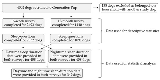 The 16 week survey was completed for 2493 dogs and the sleep questions were answered for 2332 dogs. The 12 month survey was completed for 1140 dogs and responses to sleep questions were provided for 1091 dogs. Throughout, all available data were used for summary statistics. However, for the statistical analysis of average sleep during (1) daytime, (2) nighttime, and (3) in total over a 24 h period, three subpopulations of dogs where owners provided data in both the 16 week and 12 month timepoints were used (Figure 1).