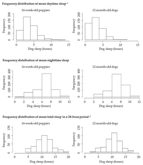 Summary of owner-reported sleep duration at daytime (n = 408), nighttime (n = 662) and in total over a 24 h period (n = 349) for dogs with data reported in both the 16 week and 12 month surveys. 1 One dog was removed from the 16 week daytime sleep histogram due to being an outlier. 2 One dog was removed from the 16 week total sleep histogram due to being an outlier.