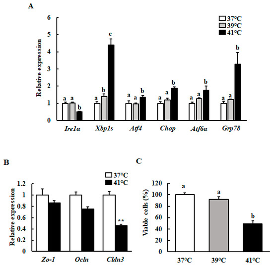 Effect of different temperatures on the mRNA levels of the UPR- and TJ protein-related genes, as well as on cell viability. After reaching 90%–100% confluence, HC11 cells were incubated at 37 °C (control), 39 °C for 72 h, or 41 °C for 6 h. (A) The mRNA level of Ire1α, Xbp1s, Atf4, Chop, Atf6α, and Grp78 were determined using RT-qPCR and normalized to that of GAPDH. (B) The mRNA level of Zo-1, Ocln, and Cldn3 were determined using RT-qPCR and normalized to that of GAPDH. (C) Cell viability was measured using an MTT assay. The results are expressed as the mean values ± SEM for four independent experiments. Means with different letters are significantly different, p < 0.05. ** p < 0.01 compared to the control.