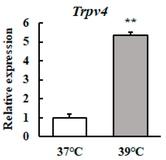 Our study indicates that the transcript level of Trpv4 was significantly higher in cells cultured at 39 °C than that in cells cultured at 37 °C. Previous studies suggested that, under many different experimental conditions, TRPV4 maintains a substantial degree of temperature-dependent activity over a range of temperatures (between 30 °C and 40 °C) [20,21]. Therefore, mild heat treatment induces TRPV4 activity in mammary epithelial cells.