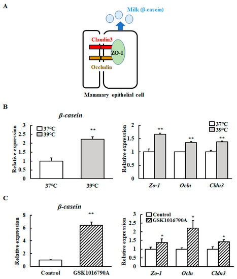 Levels of β-casein and TJ protein-encoding gene transcripts with and without a TRPV4 agonist. (A) Schematic diagram of Cloudin3, Occludin, ZO-1, and β-casein in mammary epithelial cells. (B) HC11 cells were maintained at 37 °C or exposed to 39 °C without differentiation medium for 72 h or (C) HC11 cells were incubated at 37 °C without (control) or with 10 μM GSK1016790A for 24 h. The mRNA levels of β-casein, Zo-1, Ocln, and Cldn3 were detected by RT-qPCR. GAPDH was used as the reference gene. The results are expressed as the mean values ± standard error of the mean from four independent experiments. * p < 0.05 and ** p < 0.01 compared to the control.