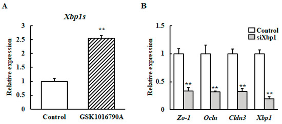 Our present study indicates that TRPV4 activation with GSK1016790A increased the Xbp1s transcript level. TRPV4 activation leads to Ca2+ influx [28,29]. The mammalian UPR is a highly preserved signaling cascade that is commenced during endoplasmic reticulum (ER) stress conditions. The ER is an organelle that is responsible for the storage of Ca2+. It is reported that ER Ca2+ depletion activates XBP1 [30]. Activation of TRPV4 channels after intracerebral hemorrhage leads to the destruction of Ca2+ homeostasis, which in turn caused UPR [31]. Though further investigation is necessary, it is speculated that TRPV4-mediated Ca2+ signaling regulates Xbp1s expression. In addition, the increased mRNA expressions of β-casein, Zo-1, Ocln, and Cldn3 by mild heat treatment was inhibited by Xbp1 knockdown. The results suggest that XBP1 regulates the expression of the TJ protein-encoding genes. This result is consistent with previous reports that the IRE1-XBP1 pathway regulates retinal pigment epithelium TJs [32]. Because XBP1 is a transcription factor, it will be necessary to clarify whether it directly regulates the expression of these genes.