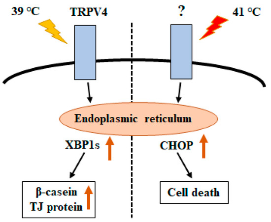In conclusion, the results indicate that mild heat stress induces the transcriptional level of Xbp1s via TRPV4 activity, which enhances the expression of the β-casein and TJ protein-encoding genes. On the other hand, severe heat stress induces the transcriptional level of Chop, which reduces the cell viability. It is speculated that the difference in UPR gene expression upon stimulation at 39 °C vs. 41 °C controls cell survival vs. cell death. Moreover, our data suggest that Trpv4 expression increased during gestation but decreased during lactation. These findings provide new insights into the possible function of TRPV4 in mammary gland development.