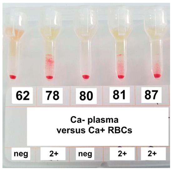 Agglutination on gel technique for anti-Ca alloantibodies detection. Gel columns show negative reaction (samples n. 62, 80) and positive reactions with strength of agglutination 2+ (samples n. 78, 81, 87).