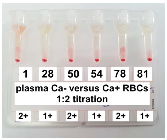 The agglutinin titer of antibodies is defined as the highest dilution of plasma in which agglutination against Ca+ RBCs can still be detected. This was determined by creating 2-fold serial dilutions (starting from 1:2) of the plasma sample in phosphate buffered saline solution up to the highest dilution at which agglutination could be detected [13]. The gel column agglutination on gel technique was then repeated using these serodilutions. The various suspensions were incubated at 37 °C for 15 min centrifuged in the special column gel card centrifuge at 80× g for 10 min and evaluated for the presence and strength of agglutination as described above. The specificity of antibodies (i.e., IgG vs. IgM) was measured by treating the plasma samples with an equal volume of 0.1 M 2-mercaptoethanol and incubating at 37 °C for 60 min. 2-Mercaptoethanol abolishes the agglutination and complement-binding activities of IgM antibodies (by cleaving their disulfide bonds), allowing IgG antibodies to be detected. After incubation, the agglutinin specificity was determined based on the presence or absence of agglutination as described above [14].