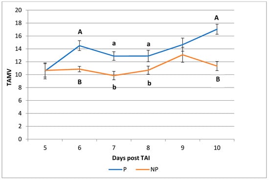 - Siqueira, L.G.; Arashiro, E.K.; Ghetti, A.M.; Souza, E.D.; Feres, L.F.; Pfeifer, L.F.; Fonseca, J.F.; Viana, J.H. Vascular and morphological features of the corpus luteum 12 to 20 days after timed artificial insemination in dairy cattle. J. Dairy Sci. 2019, 102, 5612–5622. [Google Scholar] [CrossRef]