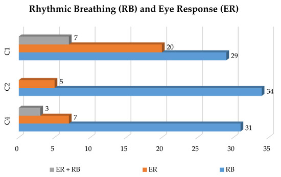 Number of animals with rhythmic breathing (RB) and eye response (ER) or both (RB + ER) in the 400 animals assessed by each operator (C4, C2, and C1).