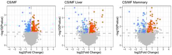Volcano plot for the genes statistically (A false discovery rate (FDR) < 0.2) affected by corn stover (CS) vs. mixed forage (MF) diet in both liver and mammary tissue (CS/MF; 140 up- and 152 down-regulated), liver (CS/MF Liver; 56 down- and 83 up-regulated), and mammary tissue (CS/MF Mammary; 63 up-D and 57 down-regulated). Red and blue dots represent upregulated and downregulated DEG, respectively.