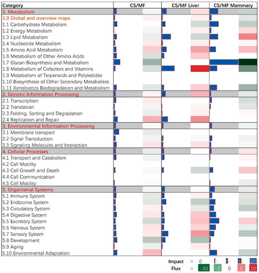 Summary of the main categories and sub-categories of Kyoto Encyclopedia of Genes and Genomes (KEGG) pathways as results of the transcriptomic effect on mammary (M) and liver (L) tissue of corn stover (CS) compared to mixed forage (MF) ration in dairy cows as analyzed by the Dynamic Impact Approach. On the right are the bar denoting the overall impact (in blue) and the shade denoting the effect on the pathway (from green—inhibited—to red—activated). Darker the color larger the activation (if red) or inhibition (if green) of the pathway.
