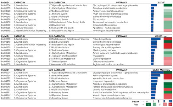 In the mammary tissue, CS vs. MF had the largest impact on metabolic-associated pathways (Figure 2, CS/MF Mammary). All top impacted pathways by CS vs. MF are associated with “Metabolism” and “Organismal Systems” with the most impacted pathway being “Glycosphingolipid biosynthesis—ganglio series” which was inhibited (Figure 3, CS/MF Mammary). This pathway is among the most activated during lactation in dairy cows, as revealed by a large transcriptomic study [47], with still an unknown clear association with milk synthesis. In this study, the milk production of CS cows was only numerically lower than MF cows.