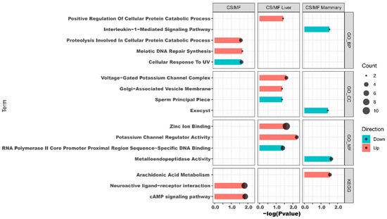 The results of DAVID analysis of DEG affected by CS vs. MF when considering both liver and mammary tissue are shown in Figure 4, CS/MF (complete DAVID results are available in File S3). The up-regulated DEG were enriched by KEGG pathways “cAMP signaling pathway” and “Neuroactive ligand-receptor interaction” and by the GO biological processes “meiotic DNA repair synthesis” and “proteolysis involved in cellular protein catabolic process”. The GO biological processes “Cellular response to UV” was the only enriched term among downregulated DEG. Cyclic adenosine 3′,5′-monophosphate (cAMP) is one of the most common and universal second messengers in cells. The cAMP pathway is induced by ligands including hormones, neurotransmitters, and other signaling molecules [23]. Neuroactive ligand-receptor interaction pathway is a collection of receptors and ligands associated with intracellular and extracellular signaling pathways on the plasma membrane [24]. According to KEGG, the cAMP pathway is integral to the “Neuroactive ligand–receptor interaction” pathway (Figure S1, File S4). cAMP plays a pivotal role in neuronal survival [25]. Thus, in this study, the concomitant induction of “cAMP signaling pathway” and the “Neuroactive ligand–receptor interaction” could indicate an increase in sensitivity of innervations in liver and mammary tissues in CS vs. MF pathway. Detail visualization of the “Neuroactive ligand–receptor interaction” pathway (Figure S1, File S4) revealed that the enrichment of this pathway was due to increase in expression in CS vs. MF of genes involved in the epinephrine, neuropeptides, glutamate ionotropic, and GABA receptors. Interestingly, epinephrine are known to inhibit oxytocin induction of milk let down, partly due also to an effect on the myoepithelial cells [26]. However, the same pathway was not enriched in up-regulated DEG in CS vs. MF in mammary tissue; thus, it is unclear the significance of the enrichment of the above pathways.