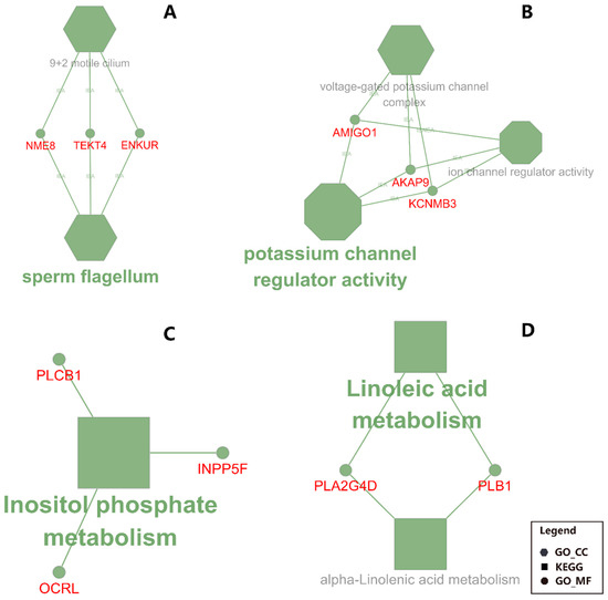 Functional annotation for liver and mammary in CS (corn stover) compared to MF (mixed forage) uncovered by ClueGO. Shown are the enriched terms in DEG between CS vs. MF. Particularly: (A) down-regulated DEG in liver; (B) up-regulated DEG in liver; C: down-regulated DEG in mammary tissue; (D) up-regulated DEG in mammary tissue. The size of the nodes reflects the statistical significance of each term. Larger the node size, smaller the P-value. The name of each group is given by the most significant term/pathway of the group. The nodes are grouped by similarity of their associated genes. The nodes in hexagon represents the terms of GO Cellular Component; the nodes in octagon represents the terms of GO Molecular Function; the nodes in rectangle represents the KEGG pathway. The small circles with symbols in red font represent the genes associated with the corresponding terms or pathways.