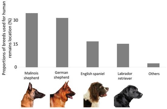 Human remains detection dogs (HRDDs) are “canines specially trained to find human decomposition scent and alert their handler to its location” []. In addition to be called cadaver dogs, HRDDs are most likely less known than other categories of working scent-detection dogs such as explosive or drug detection dogs. However, they are used by law enforcements in many contexts including homicides, as well as natural and manmade disasters to search for human cadavers, body parts, or fluids [,,,,,,]. These activities are usually gathered under the term necrosearch [].