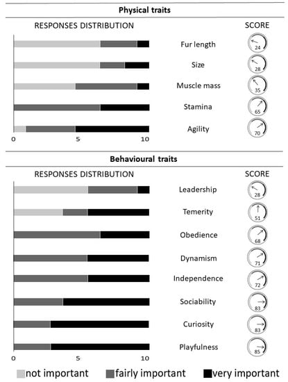 Handlers’ estimation of the importance of the physical and behavioral traits that must be considered during the selection of human remains detection dogs. The response distribution describes the percentage of handlers (out of 50) that estimate the importance of each trait (not important, fairly important, very important). The score estimates the importance of the traits during the selection according to Equation (1).