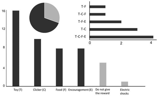Types of operant conditioning used by the surveyed handlers (y axes, N = 50) to train their human remains detection dogs with the pie chart representing the proportion of reinforcement and punishment technics used (light grey: punishment, dark grey: reinforcement).