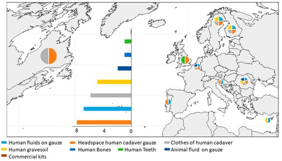 - Rosier, E.; Loix, S.; Develter, W.; Van de Voorde, W.; Tytgat, J.; Cuypers, E. Time-dependent VOC-profile of decomposed human and animal remains in laboratory environment. Forensic Sci. Int. 2016, 266, 164–169. [Google Scholar] [CrossRef]