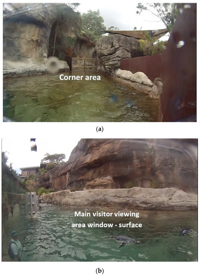 Camera fields of view (a). ‘Corner’ area (not visible to visitors); (b). ‘Main visitor viewing area window’ area (above water); (c). ‘Main visitor viewing area window’ area (underwater).