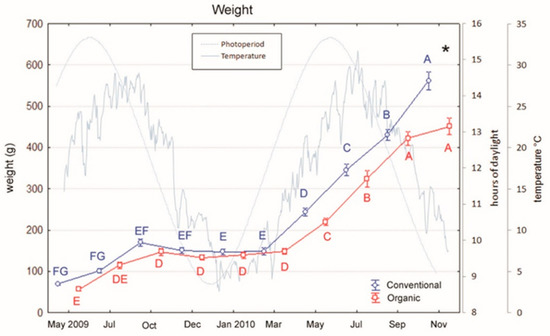 Variations in weight of sea bass over an 18-month period (mean ± SE) reared under conventional and organic aquaculture. Different letters indicate significant differences in samplings within the same feeding system (organic or conventional; p < 0.05). Asterisk indicates significant differences between feeding systems (organic vs. conventional) within the same sampling (p < 0.05).