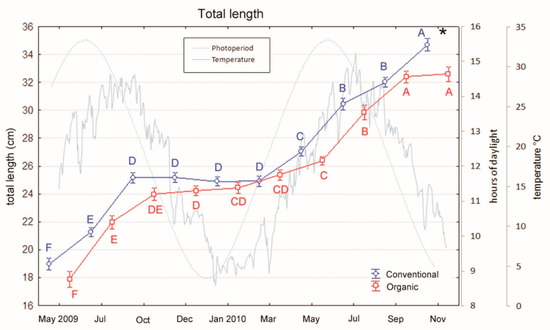 Variations in total length of sea bass over an 18-month period (mean ± SE) reared under conventional and organic aquaculture. Different letters indicate significant differences in samplings within the same feeding system (organic or conventional; (p < 0.05). Asterisk indicates significant differences between feeding systems (organic vs. conventional) within the same sampling (p < 0.05).