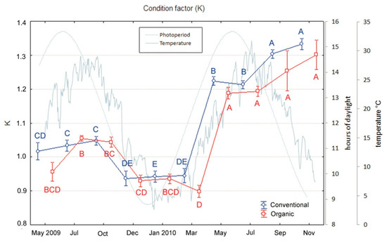 Variations in condition factor (K) of sea bass over an 18-month period (mean ± SE) reared under conventional and organic aquaculture. Different letters indicate significant differences in samplings within the same feeding system (organic or conventional; p < 0.05).