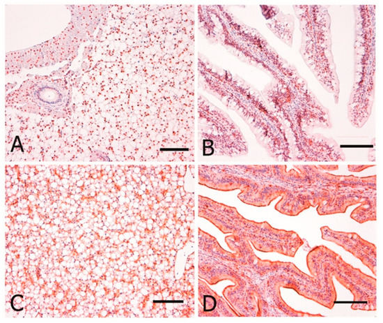 Immunohistochemical localization of CYP1A and 8-OHdG in sea bass. All panels are counterstained with Harryr’s hematoxylin. Scale bar: 50 µm. (A) Liver, strong and diffuse nuclear immunoreactivity of hepatocytes to anti-8-OHDG antibody; (B) Gut, nuclear immunoreactivity of most enterocytes to anti-8-OHDG antibody; (C) Liver, endothelial, and sinusoidal immunoreactivity of hepatocytes to anti-CYP-1A; (D) Gut, diffuse strong immunoreactivity of the intestinal mucosa to anti-CYP-1A.