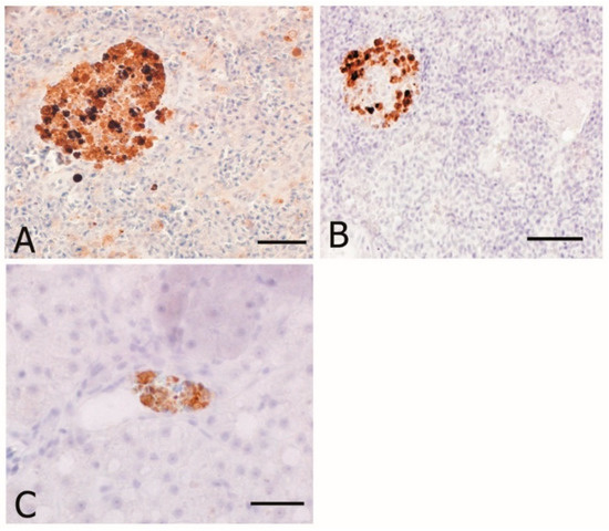 Immunohistochemical localization of HNE in sea bass. All panels are counterstained with Harryr’s hematoxylin. Scale bar: 50 µm. HNE-immunostaining is present in several melanomacrophage centers located in the parenchyma of (A) spleen; (B) kidney; (C) liver.
