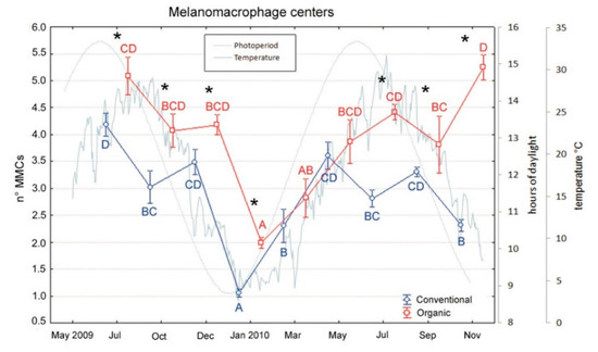Variations in melanomacrophage centers number of sea bass over an 18-month period (mean ± SE) reared under conventional and organic aquaculture. Different letters indicate significant differences in samplings within the same feeding system (organic or conventional; p < 0.05). Asterisks indicate significant differences between feeding systems within the same sampling (p < 0.05).