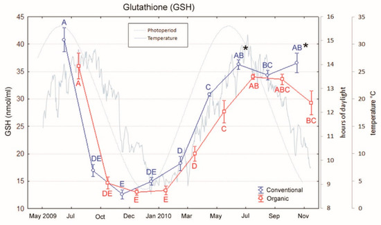 Variations in glutathione of sea bass over an 18-month period (mean ± SE) reared under conventional and organic aquaculture. Different letters indicate significant differences in samplings within the same feeding system (organic or conventional; p < 0.05). Asterisks indicate significant differences between systems within the same sampling (p < 0.05).
