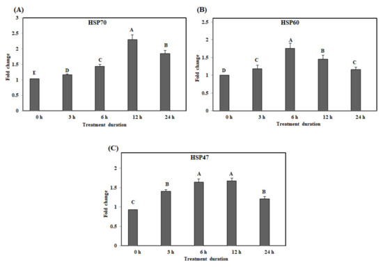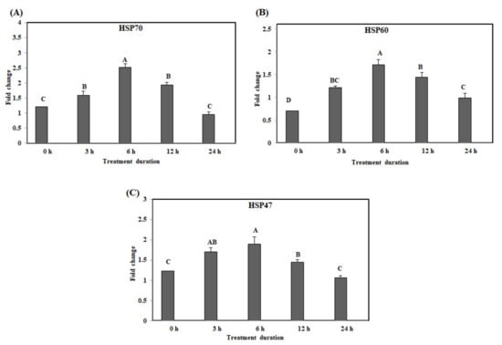 The gene expression levels of HSP70 in the ileum were significantly up-regulated at 3 h with acute heat stress and the up-regulated HSP levels were maintained until 12 h, with acute heat stress (p < 0.05) (Figure 3A). The gene expression levels of HSP60 gradually increased after 3 h and were at their highest at 6 h (Figure 3B). The gene expression levels of HSP47 were significantly higher at 6 h than at 0, 12, and 24 h (Figure 3C).