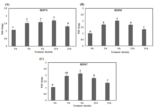 The mRNA expression of the heat shock proteins in the duodenum of chickens exposed to acute heat stress for different durations of time (n = 8). The mean relative expression of HSP70 (A), HSP60 (B), and HSP47 (C). A–D HSP70, HSP60, and HSP47 in the columns with different superscript letters differ significantly (p < 0.05) among the different heat exposure durations.
