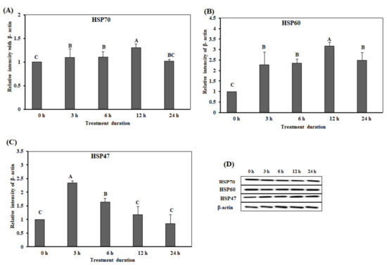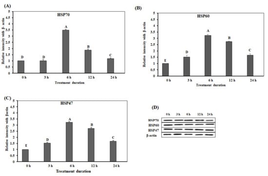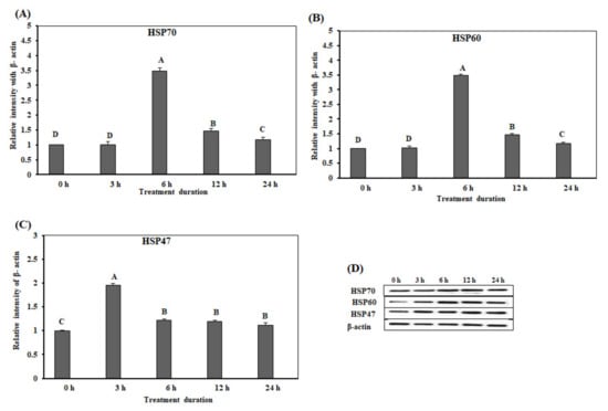 The expression of the heat shock proteins in the duodenum of chickens exposed to acute heat stress for different durations of time (n = 8). The mean relative expression of HSP70 (A), HSP60 (B), and HSP47 (C). (D) Western blot analysis results. A–D HSP70, HSP60, and HSP47 in the columns with the different superscript letters differ significantly (p < 0.05) among the different heat exposure durations.