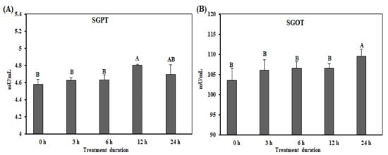 Each blood sample was collected from the wing vein int o non-heparinized tubes, immediately before sacrifice. The blood sample was centrifuged at 3000× g for 15 min at 4 °C, to obtain the serum. The serum was stored at −80 °C until analysis. The levels of SGPT and SGOT were measured using colorimetric commercial kits (Asan Pharmaceutical, Co. Ltd., Seoul, Republic of Korea), following the manufacturer’s instructions.