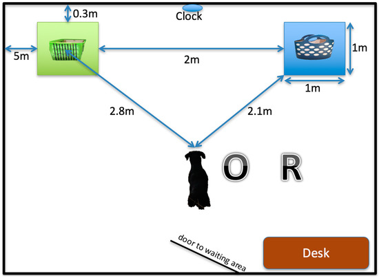 To do this, the owner was asked to walk the dog from the waiting area to the designated starting point, and then stand next to the dog, looking ahead at a clock placed centrally on the wall (see Figure 1). The owner and the researcher wore dark sunglasses at all times. The researcher stood in a marked, designated area on the right hand side of the owner, and cued the owner to release the dog on the “Go” command after the dog continuously looked towards the setting for at least 2 s. On the first two occasions, a piece of sausage was visibly placed inside the correct object, which was placed on the right and left designated area (both sides baited for every dog), to motivate the dogs to approach it after the release cue. After the dog approached an object, the researcher used either a click sound followed by a reward (one piece of pork or chicken sausage fed by hand from the researcher) or a spoken “Wrong” in a neutral voice. After each trial, the owner and the dog returned to the waiting area until being called back in by the researcher for the next trial. The location of the objects was pseudo-randomized using the free online software Research Randomizer [14], such that each object was presented on the left and right side an equal number of times, but not on the same side for more than two consecutive trials, to prevent the development of a side bias by the dogs. The dog was considered to have made a choice when 2 paws were placed on the cardboard square of the object. No choice was defined as the dog not having two paws on either square within 30 s after the release cue. Trials where no choice was made were not counted as correct or incorrect, instead the same trial was repeated. Three consecutive no choices were followed by a break. Another 3 consecutive no choices after a break led to the exclusion of the dog from the study. After a correct choice, the researcher continued with the next trial; whereas after a wrong choice, the same trial was presented again until the dog made a correct choice. Three consecutive wrong choices in the same trial resulted in the owner walking the dog over to the correct object, which was followed by the next trial. The criterion was met when the dog had an 80% or higher correct choice in two consecutive sessions, each session consisting of 10 trials. After each session, breaks of 5 to 10 min were given, during which the dogs were allowed to relax in the surrounding area.