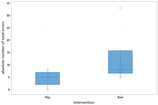 The playful activities group made significantly less total errors than the resting group (Mann–Whitney U test, U = 4.5, critical value of U is 5, Z = 1.8, p = 0.03), which is shown in Figure 3. The median number of total errors for the playful activities group was five (interquartile range: 2–7), and for the resting group was eight (interquartile range: 7–16).
