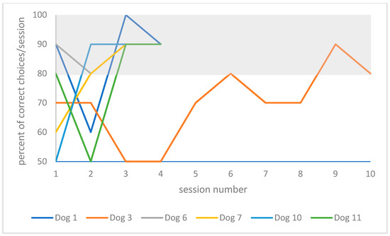 No dog was excluded from the study population; all dogs passed the pre-training criterion within one session. In addition, all dogs reached the training criterion successfully. No “no choices” were recorded.