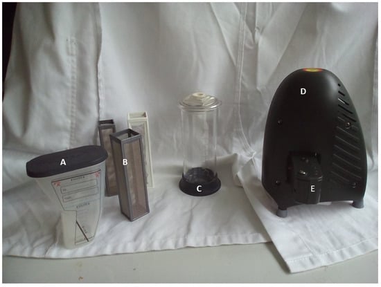 The supplied FECPAKG2 equipment. A: Sedimentor; B: 1 mm white pre-filter and 600 and 425 µm silver filters; C: filter cylinder; D: Micro-I imaging device; E: FECPAKG2 cassette, inserted into Micro-I.