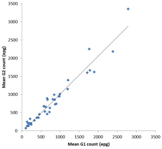 Comparison between the mean G1 and mean G2 counts for each equine faecal sample. The data analysis demonstrates a strong positive correlation between both the established G1 method and the novel G2 method for equid faecal egg counts. The mean percentage accuracy (mean G2 count as a percentage of the mean G1 count, ±SE) was determined at 101 ± 4%.