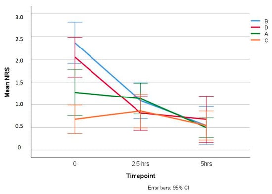 As it can be difficult to quantify pain in lambs [], most studies report a combination of approaches. We used several methods to assess both behavioural and physiological changes related to pain. The chosen method to assess the pain-related behaviour used a numerical rating scale (NRS) that was developed in a previous study [] and has been used in several subsequent studies [,]. The most accurate pain-related behaviour measurements are obtained with data collected from the first 60 min after treatment [], although as our study used a measure at 30 min, acceptable accuracy may also be obtained with shorter periods. Further, behaviours recorded as events rather than time spent carrying out the activity, are considered as preferred indicators of pain, due to the broad variation in response to the same stressor []. In our study, combining different activities into a single index compensates to some extent for this individual variation [].