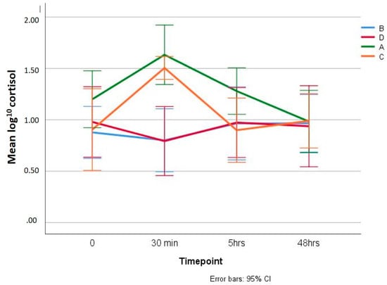 Mean of log10 cortisol in the four Groups A, B, C, and D, prior to tail docking (C0), and at 30 min (C1), 5 h (C2) and 48 h (C3) intervals post-tail excision (Error bar: 95% CI). Groups A and C, the tail was excised with a scalpel without anaesthesia or stitches; Groups B and D, the tail was surgically excised and stitched under GA; with Groups C and D immediately sprayed with PR.