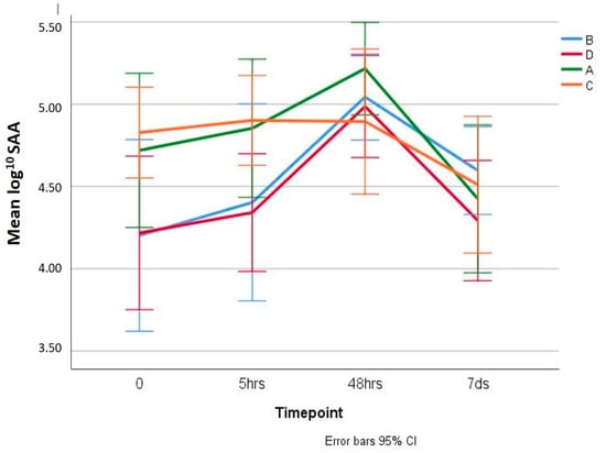 Mean of log10 SAA in the four Groups A, B, C, and D, prior to tail docking (S0), and at 5 h (S1) and 48 h (S2) intervals, plus seven days later (S3) (Error bar: 95% CI). Groups A and C, the tail was excised with a scalpel without anaesthesia or stitches; Groups B and D, the tail was surgically excised and stitched under GA; with Groups C and D immediately sprayed with PR.
