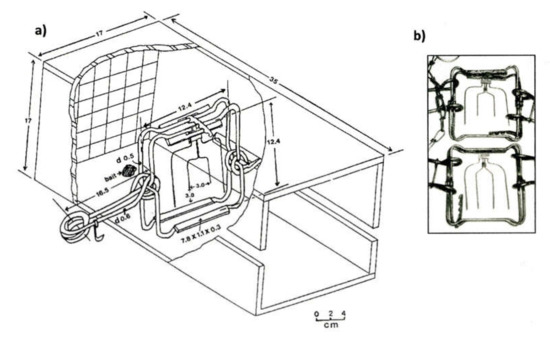 The ability of the C120 Magnum rotating-jaw trap to render American martens irreversibly unconscious in ≤3 min in compounds [34] and on traplines [36] was tested with a four-prong trigger and a specific cubby box (a) [60]. The trigger has two short centre prongs to properly position the animals in the traps and ensure a strike in vital regions [60]. When the original trigger was replaced with a four-long-prong trigger (b), the trap did not properly strike animals in the head [34] and was not as capture-efficient [98].